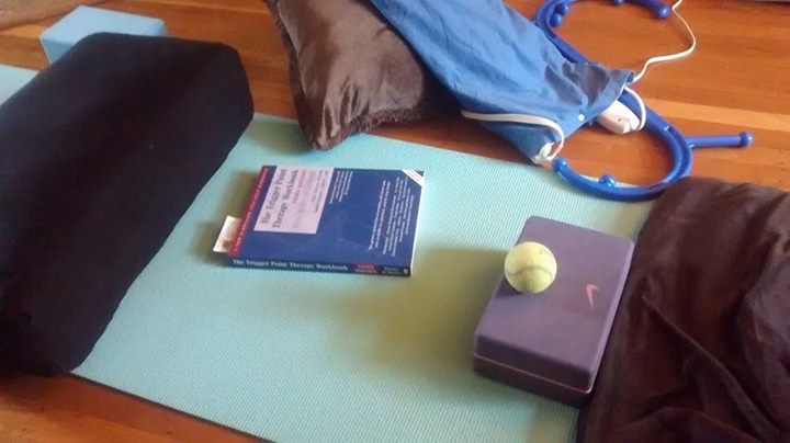 My yoga mat, bolster, a folded blanket, a heating pad, a yoga block, a tennis ball, and my phone to set my alarm.