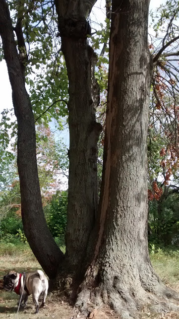 What seemed like one tree with three trunks, was actually a maple with two trunks and a oak with one!